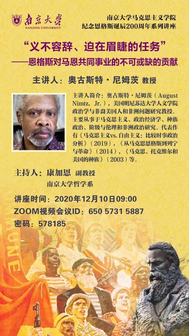 奥古斯特·尼姆茨(August Nimtz,Jr.),美国明尼苏达大学人文学院政治学与非裔美国人和非洲问题研究教授。主要从事于马克思主义、政治经济学、种族政治、阶级与伦理和非洲政治研究。代表作有《马克思主义vs.自由主义:比较时事政治分析》(2019),《从马克思恩格斯到列宁与革命》(2014),《马克思、托克维尔和美国的种族》(2003)等。
